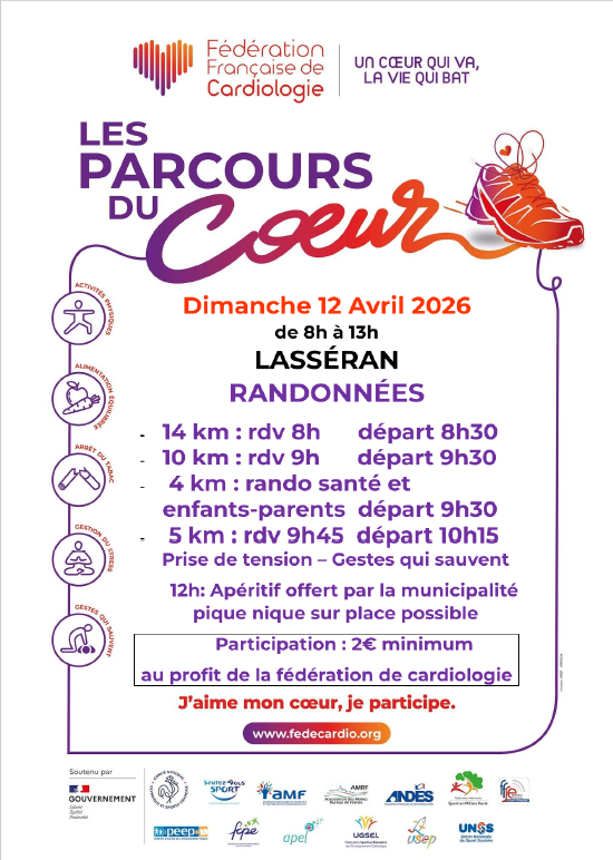 Les sections gym et yoga, l’Amicale des donneurs de sang bénévoles, le Foyer rural, l’APE, la municipalité, les Randonneurs Gascons et quelques autres volontaires… sont heureux de vous inviter à participer au “Parcours du Cœur” qui aura lieu à Lasséran le dimanche 12 avril 2026 de 8h30 à 15h.