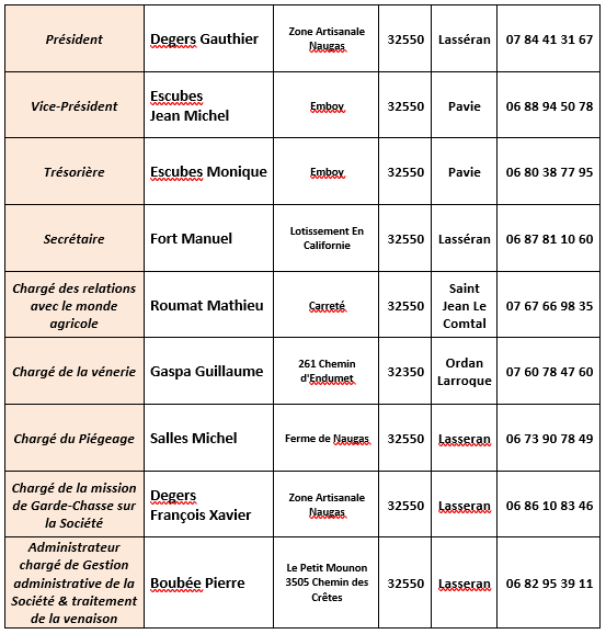 Cette saison, 20 chasseurs adhèrent à notre association, 5 sont propriétaires terriens, 10 résidents à Lasséran et 5 étant des membres extérieurs à la commune, avec une moyenne d’âge de 55 ans. Le plus jeune à 26 ans étant notre Président.
